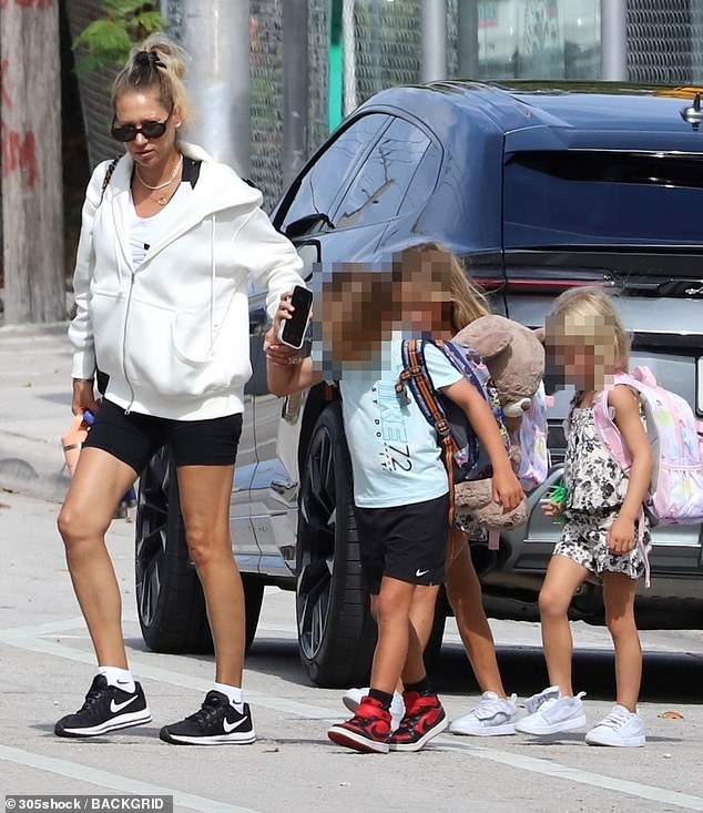 Her children, meanwhile, appeared well-equipped for their karate class, carrying packed backpacks, while her eldest daughter Lucy clutched a giant fluffy teddy bear.